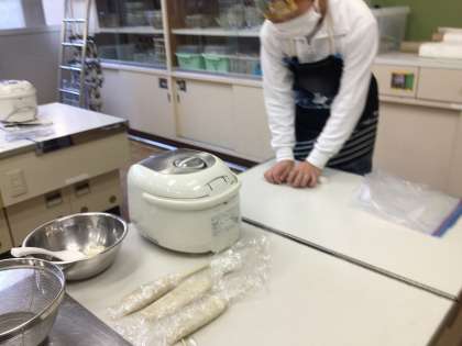 手順を先生から聞いて、ほかほかのご飯をビニール袋に入れてつぶします。