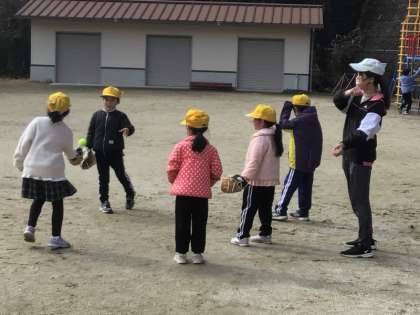 月曜日は1年生です。慣れるまでは近い距離で、優しく投げて捕るようにしています。ボールも柔らかめのものです。これからだんだんと、ナイスキャッチができるようになっていくことでしょう。