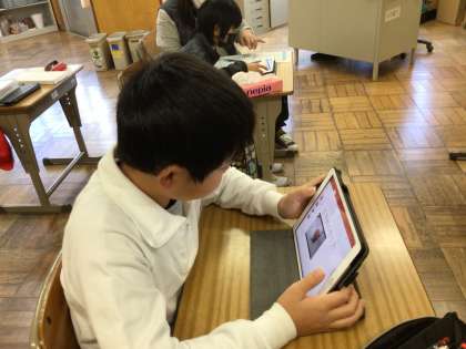 これまでの調べ学習について学習用タブレットで写真を取り込みながら、発表資料を作る子供たちでした。