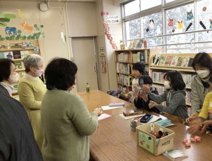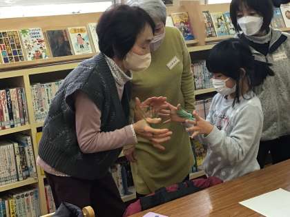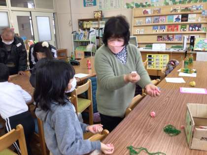 お手玉やあやとりのコーナーでは、幸海クラブの皆様が手を取り、子供たちにお手本を見せてくださいました。子供たちも、一生懸命真似をしながらなんとかできるようになってきました。