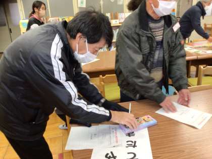 チャレンジした昔遊びのカードには幸海クラブの皆さんのサインが次々と書かれていました。