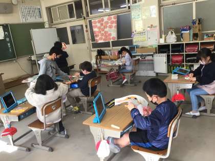 1年生の教室では、学習発表会に向けてお面作りをしていました。