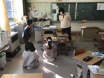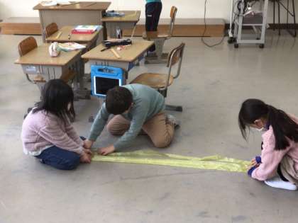 2年生は、算数で「長さ」の学習をしています。これまで、「cm」「mm」「m」を学んで、どんどん大きな単位を使えるようになってきました。今日の授業では、手を広げた長さをテープでうつしとって、長さを測る活動です。ものさしの使い方や長さの表し方、自分の体の中に1mを超える長さがあることなど、たくさんのことを学んでいました。
