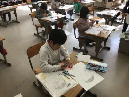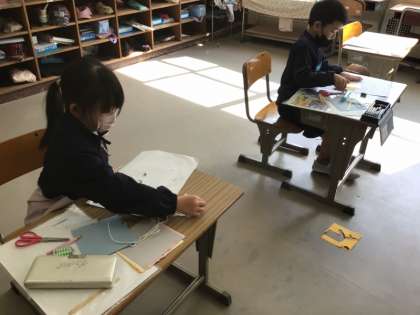 2年生は、図工で紙版画に挑戦し、台紙(版)を作っていました。紙には、いろいろな模様があり、その紙をどう組み合わせるか、糸やプチプチシートなども使って、どんな絵にするかを考えながらの制作です。細かく紙を切ってはり合わせている子もいて、どんな作品になるか楽しみです。