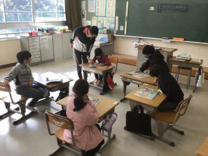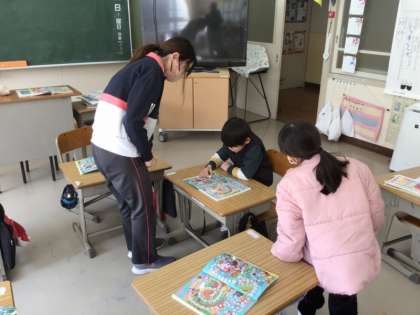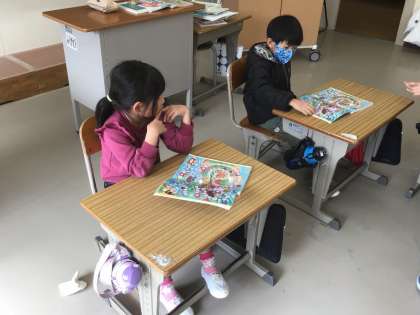 1年生は、算数ですごろくをしていました。すごろくのマスには1から100までの数が書いてあります。途中には「4すすむ」や「7もどる」など、たし算やひき算の考えを使うところもあります。みんなで楽しみながら数の復習です。