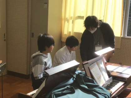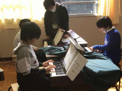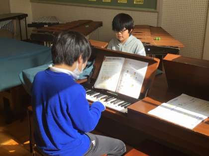 5年生は、音楽で旋律づくりに挑戦していました。旋律を作るときには、日本で古くから使われる五つの音階で考えます。リズムも考えて、オルガンの鍵盤で弾きながら、「これは」と思えるような旋律作りに取り組んでいました。