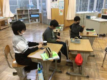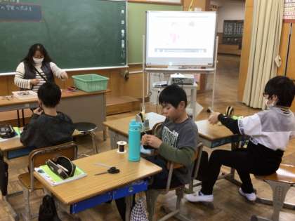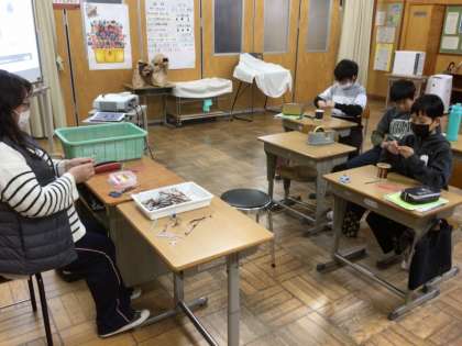 5年生は、電磁石の性質の学習をしています。導線を同じ向きに何回もまいた「コイル」を作り、鉄くぎを使って電磁石にします。導線の巻く回数を変えると変化があるのか。巻き方によって変化があるのか。条件を変えていろいろと確かめられます。子供たちは、巻いた回数を忘れないように、数えながらコイルを作っていました。