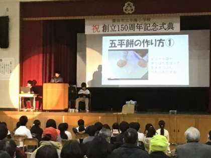 幸海地区では、ミネアサヒを作ることが多いそうですが、お米の品種はたくさんあります。愛知県で作られているお米について、それぞれの特徴を紹介しました。また、減っているお米の消費量を増やすために、五平餅作りを体験し、その作り方を発表して、「みんなでお米をもっと食べて、未来の幸海を守ろう!」とメッセージを送りました。