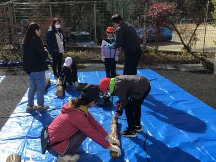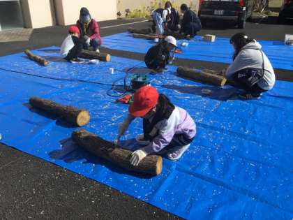 3年生が、森林組合の方を講師に招いて、しいたけの菌打ち体験をしました。使う木はコナラということを教えてもらい、印を打つことから始めました。菌を打つ場所に二人で力を合わせながら印をつけ、電動ドリルで穴をあけます。その後、菌のついた駒木を、手際よく穴に打ち付けていきました。
