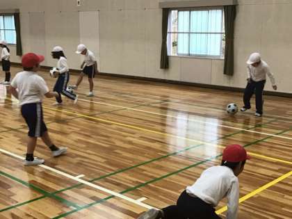 1、2年生は、体育でボール蹴りをしていました。サッカーのパスです。力強く足を振り、相手に向かってボールを蹴っています。ボールを止めるときは、足の裏を使って、ぴたりと止めています。ボールクリニックで教えてもらったことを生かしていますね。