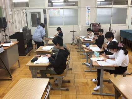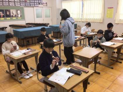 4年生は、音楽室でリコーダーを吹いていました。でも、何かの曲のようではありません。5つの音(ミ、ソ、ラ、ド、レ)で、オリジナルの旋律作りに挑戦していました。リズムは決まっているので、どの音にするかを考えています。どんな旋律ができるのでしょう。