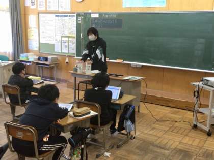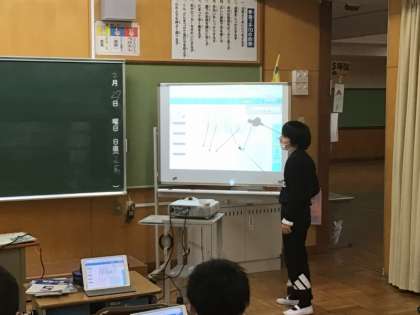 5年生は算数で、直方体や立方体といった立体の形の学習をしています。いくつかの柱状の立体を仲間分けして、どのような視点で分けたかを説明しました。よく聞かれたのが「角(かく)がある」という言葉です。形をとらえているのがわかります。「底面」「側面」といった言葉も知り、これからさらに立体について詳しく学んでいきます。