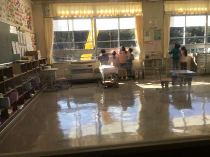 窓から突然現れたクレーンに1年生の子供たちはびっくり。先生のお許しを得て、かぶりつきで見学させてもらっていました。国語説明文の「いろいろな船」につながる、自動車の仕組みに興味津々の子供たちでした。