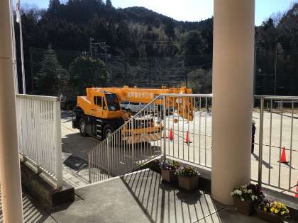 室外機を屋上に取り付ける作業があるため、今日は特別にクレーン車が学校にやってきました。