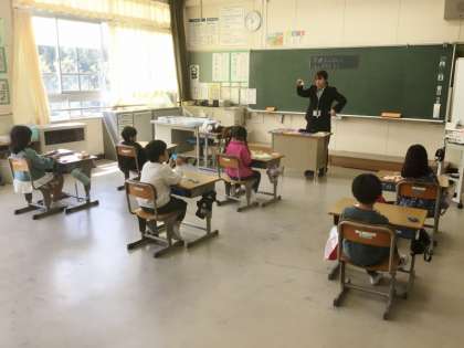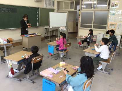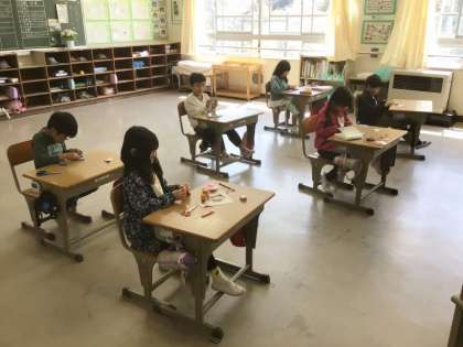 2年生は、折り紙を折って、何かを作っています。「ねこ」と教えてくれました。よく見ると耳があります。どうやら、学校探検の準備のようで、先生の説明を聞きながら、順番に作っています。作ったものは、どう使うのかな。楽しみです。
