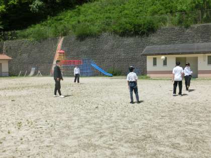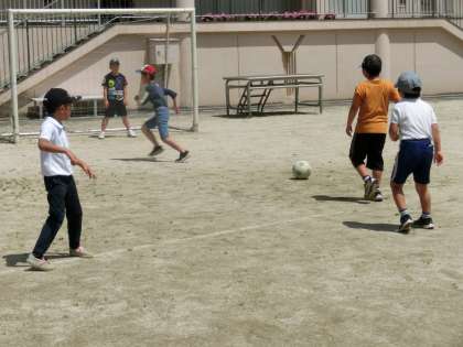 快晴の青空のもと、なかよしタイムは、運動場で思いきり遊びました。先生も一緒になってサッカーをしていました。