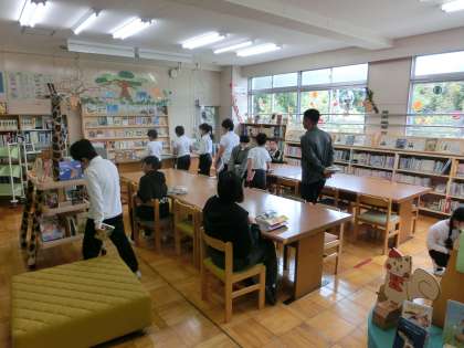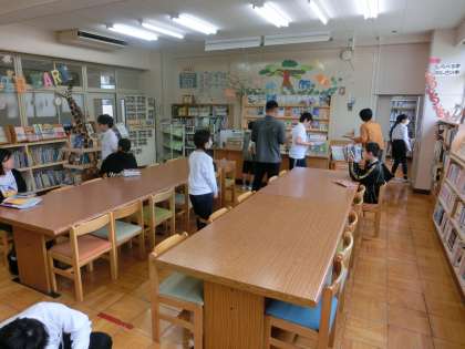 今日は、朝の活動は高学年の図書室優先日です。「どの本にしようかな。」