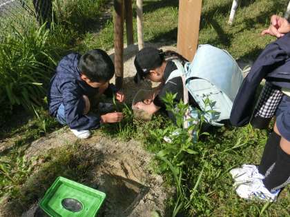 朝昇降口でお出迎えすると「ジャンボダンゴムシ」とまん丸になったダンゴムシを見せてくれました。また、運動場の隅で虫かごのお世話、ホウセンカやひまわりに水やりをするなど元気いっぱい活動しています。