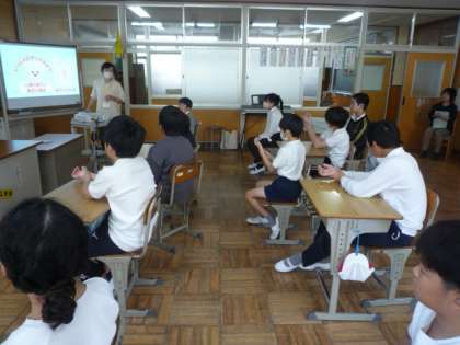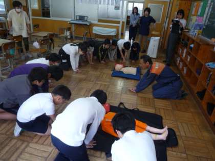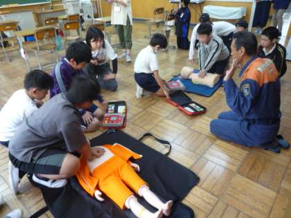 2時間目は、5・6年生は合同でAEDの使い方をまなびました。消防署の方を講師にお招きし、はじめに、胸骨圧迫の仕方を学習し、人形を使い全員で実習を行いました。また、同時にAEDの使い方も学びました。