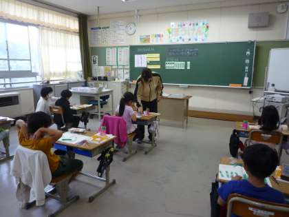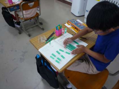 2年生の算数はひきざんのひっさんです。説明を聞いた後は、数え棒を使って確かめです。答えは合っていたかな。
