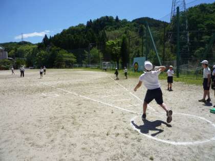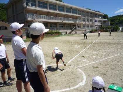 2年生と5年生が協力して計測をしました。何メートル投げれたかな。