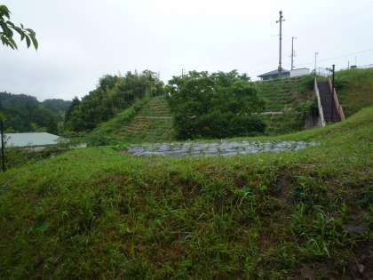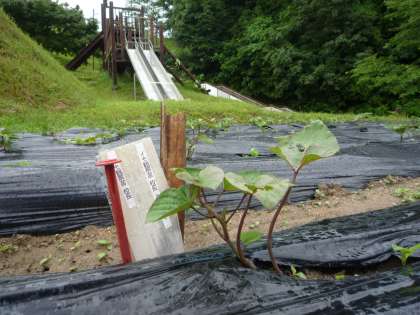 17日目のイモの苗は、今朝がたの雨で水分たっぷり、元気に育っています。写真以外の苗(運動場の南側)もすくすく育っています。