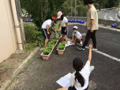 3年生は、理科で植えたヒマワリやホウセンカの観察をしていました。種から芽が出て、日に日に大きく育っています。今の様子はどうか、ノートに観察記録をまとめていました。