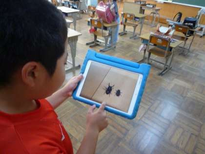 2日ぶりですが、キャンプを終え、朝の子どもたちの登校を見守ると元気な声とあいさつが響き渡っていました。教室へ行くと自宅で見つけたクワガタをタブレットで撮ってきた子や貴重な虫のの抜け殻を見せにくる子など生き物大好きな子どもたちに出会いました。