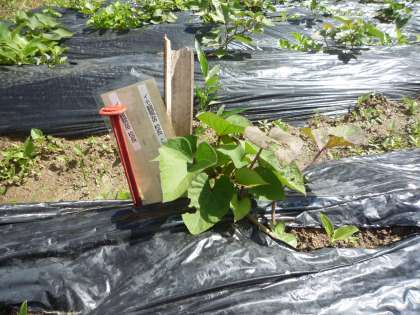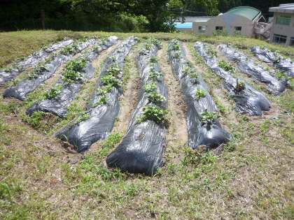 27日目になります。畑の周辺の草が気になりましたが、週末のPTA奉仕作業で草刈りをしていただききれいになりました。しかし、畝の中にイモの苗ではない葉っぱが出ていました。