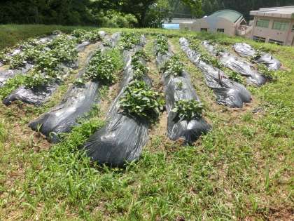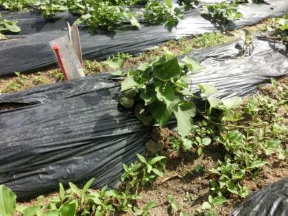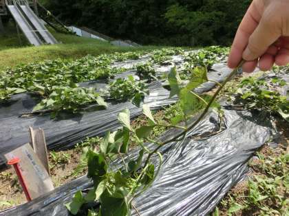 先週末は、イモの苗観察記録31日目をお知らせすることができませんでした。3日日ぶりの報告です。強い日差しと雨のおかげですくすく成長し、ツルが伸びてきました。