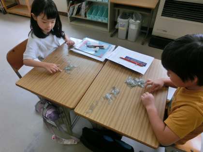 週明けの各教室を回ってみるとどの教室からも元気な発表や活動の声が聞こえてきました。1・2年生の算数では。それぞれ数を数える学習をしていました。2年生では、大量のクリップを机上に並べて数えていました。