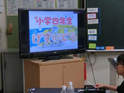 今日は、市役所から下水道の専門の方をお招きし、下水道のしくみや働きについて学びました。下水道は、私たちが使った生活排水をきれいにして川に流す仕組みです。家が集中している市街地と私たちが住んでいる幸海町周辺とは仕組みが違うことも知りました。