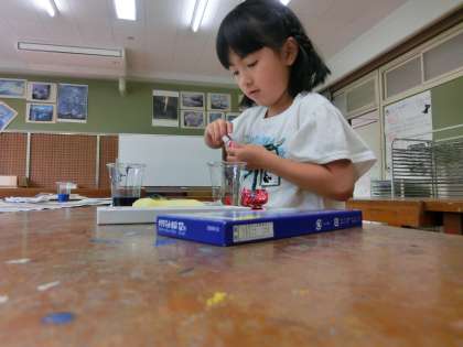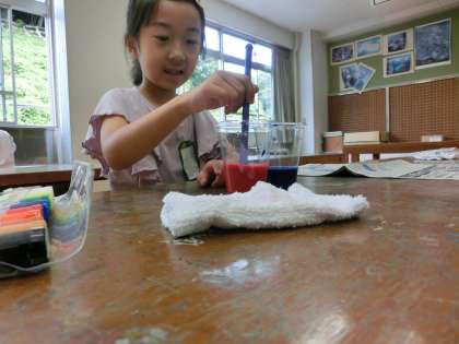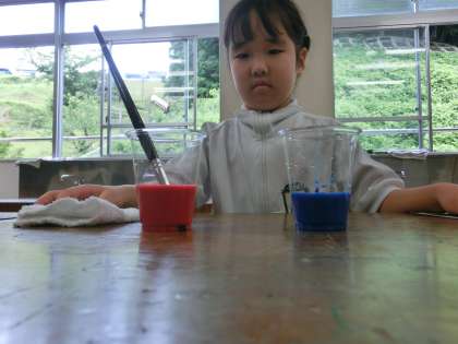 1年生の図工は、絵具で色水を作り、アジサイを色に紙を染めようとしていました、どんな作品ができたかな。