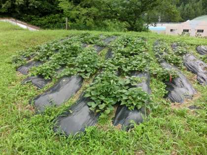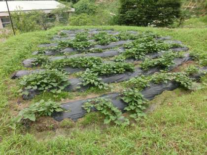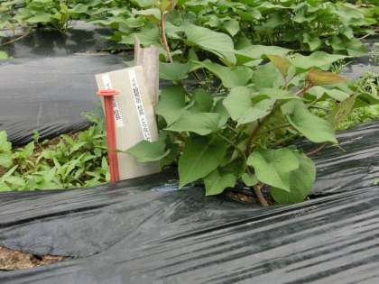 今日の観察は、雲が広がっている朝のうちに行いました。いつもと違う方向から眺めると一面葉っぱが目に入り、イモと草の境目がなくなってきました。しかし、お目当ての観察苗は元気に育っています。
