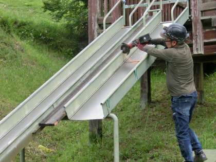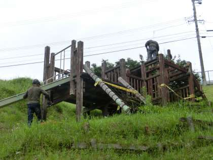 幸海ふれあいパークに設置されていました木製遊具の解体工事がはじまりました。ここ数年は、腐食して遊ぶことはできなかったかと思いますが、過去に思い出のある卒業生や保護者の方もお見えになると思います。滑り台が真っ二つに切断されて行く姿を見ると寂しい思いです。数日中には跡形もなくなると思います。