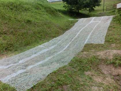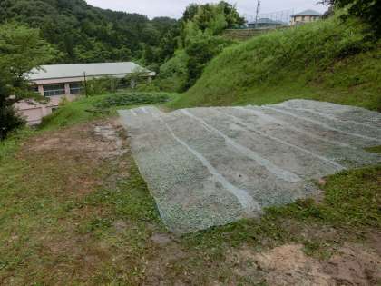 朝、木製遊具の撤去工事現場へ行くとすでに基礎部分のコンクリートだけが残されていました。日中の雨の中、コンクリートを砕く作業が行われ、夕方にはきれいに整地されました。現在は、土砂崩れ防止のネットで覆われています。そのうち草で覆われてくると思います。草で覆われた姿を想像すると雪のないゲレンデのようです。草滑りができるかもしれません。ネットが草で覆われるまでは中に入らないでください。