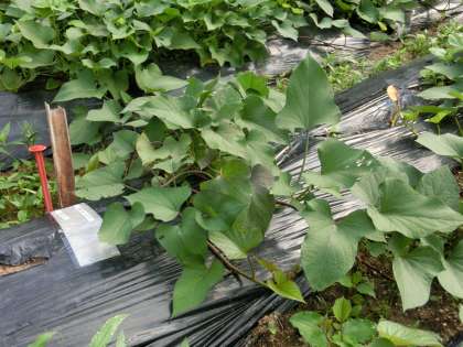 昨夜の大雨の後のイモの苗の様子です。ツルを引き上げてみると一本ではなく3本3方向に苗が伸びていました。いつの間にこんなに大きくなったのかな。