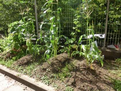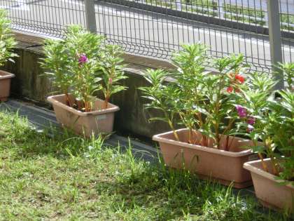 先日、1年生のアサガオの開花の情報を載せましたが、よく見ると近くの2年生のトウモロコシや、3年生のホウセンカも花が咲き、ひまわりも大きく成長していました。