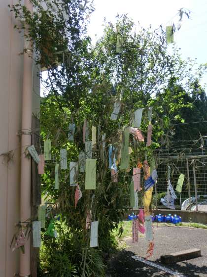 7月7日は七夕の日です。幸海小学校では、全校のみなさんの願いを短冊に託し、昇降口まえに用意した笹の葉につるしています。