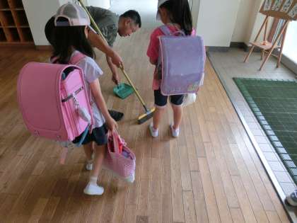 週明けの月曜日、暑い日になっています。校舎内に入ると、なんと、昇降口から教室前のろうかには、ダンゴムシの大群が待ち構えていました。みんな登校する前に大掃除です。