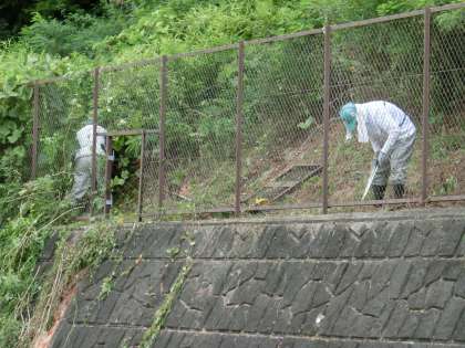 今日も暑い中、校内整備員さんが校内の伐採作業を行ってくださいました。今日は、運動場西側の高台のフェンスう上から垂れ下がっていた木やツルを伐採していただきました。2年ぶりに伐採したそうです。伸び切って下に垂れ下がった枝やツルを切ってもらいさっぱりしました。ありがとうございました。