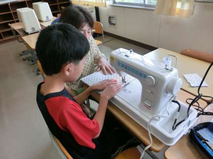 6年生の家庭科は、ミシンを使ったナップサック作りに取り組んでいます。今日は、ミシンボランティアの協力を得て活動しています。マンツーマンで指導していただき本当にありがたいです。いい作品ができるといいですね。