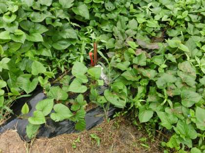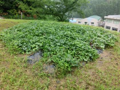 雨に濡れたイモ畑です。水分をいっぱい吸収してますます元気になりそうです。3連休明けが楽しみです。