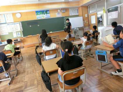 教室を回っているといつも元気な3年生の教室からいつも以上に歓声があがっていました。担任の先生が髪を切ってきたようです。いつもと違う雰囲気に「かっこいい}「イケメン」など歓声につつまれていました。温かいクラスの雰囲気を感じました。