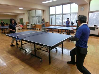 校内での研修会の後は、校内の備品を使っての実技研修でした。中学時代卓球部に所属していた教頭先生を講師として卓球教室を行いました。実技指導の後は早速、全員で卓球大会を行いました。