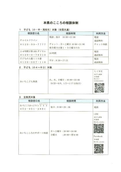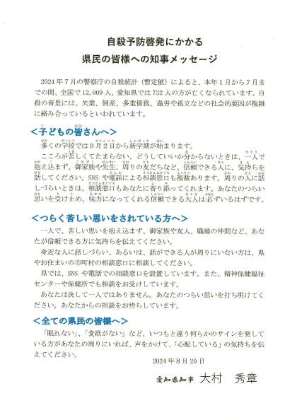 台風10号の進路予報が気になるところですが間もなく夏休みが終わります。9月からの学校生活の再開にあたり愛知県知事からメッセージが届いてます。9月からも元気に登校してくることを楽しみにしています。