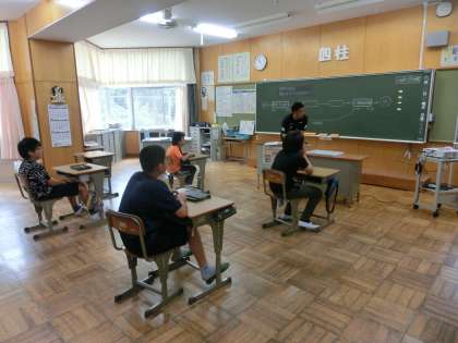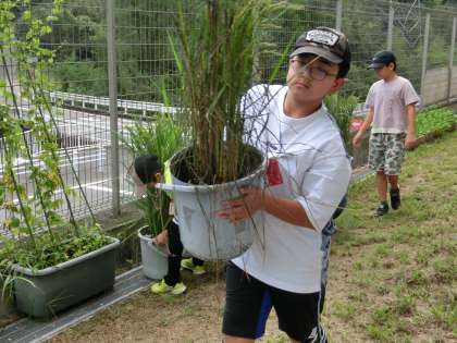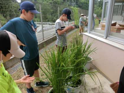 2日目になりました。授業が本格的に始まりました。5年生は、バケツ稲の観察です。場所を移動し、夏休み中の育ち具合を観察しました。6年生は、今月末に控えている修学旅行について担任の先生から説明を聞き、見学先を話し合いました¥。