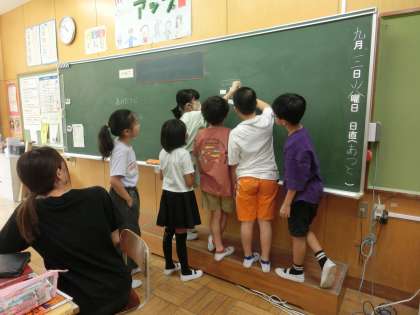 4年生の教室では、黒板に集まって話し合いをしていました。何の話し合いでしょうか。この後は、席について代表の子の司会で話し合いが行われました。