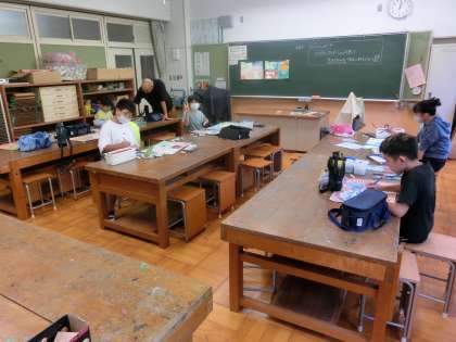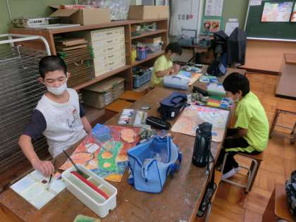 5年生の図工は、読書感想画の色塗りです。筆をトントンとたたきながら塗ります。筆を走らせずに塗る技法がとても根気が必要です。校長先生も5年生の時に教わった技法です。きっと素晴らしい作品ができると思います。