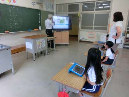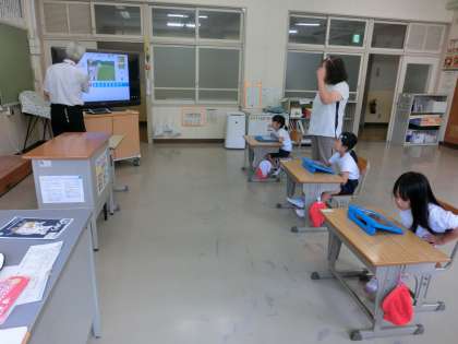 1時間目は、1年生の教室です。スクラッチを使い簡単なプログラムの学習です。